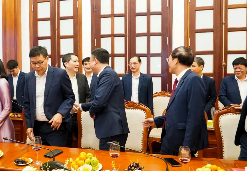 The delegation was received by Comrade Phung Quang Hiep, Member of the Executive Committee of the Government Party Committee, Secretary of the Party Committee, and Chairman of the Members’ Council; Comrade Nguyen Huu Tu, Deputy Secretary of the Party Committee, Member of the Members’ Council, and General Director; along with members of the Standing Board of the Party Committee, the Members’ Council, the Board of General Directors, and leaders of the Group’s functional departments and Office.