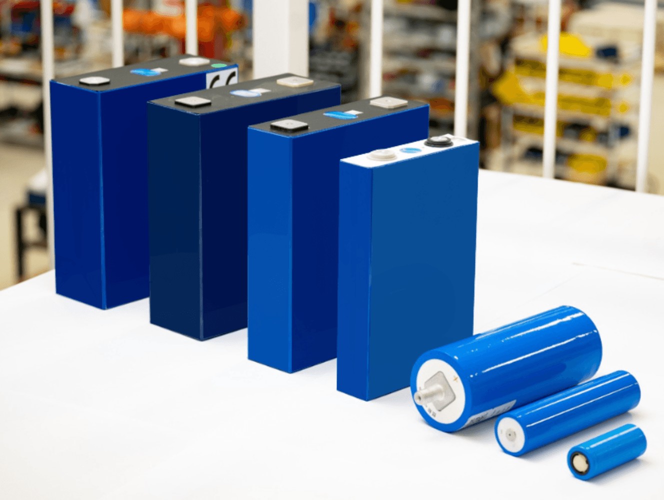 Different formats of LFP lithium battery cells, including cylindrical and prismatic used in industrial sector