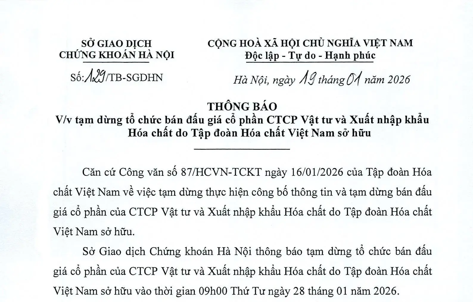 Ngày 19/01/2026, Sở Giao dịch Chứng khoán Hà Nội đã ban hành Thông báo số 129/TB-SGDHN về việc tạm dừng tổ chức bán đấu giá cổ phần của Công ty cổ phần Vật tư và Xuất nhập khẩu Hóa chất do Tập đoàn Hóa chất Việt Nam sở hữu, dự kiến tổ chức vào hồi 09h00, thứ Tư, ngày 28/01/2026.XEM TIẾP06:23 CH @ 26/12/2025